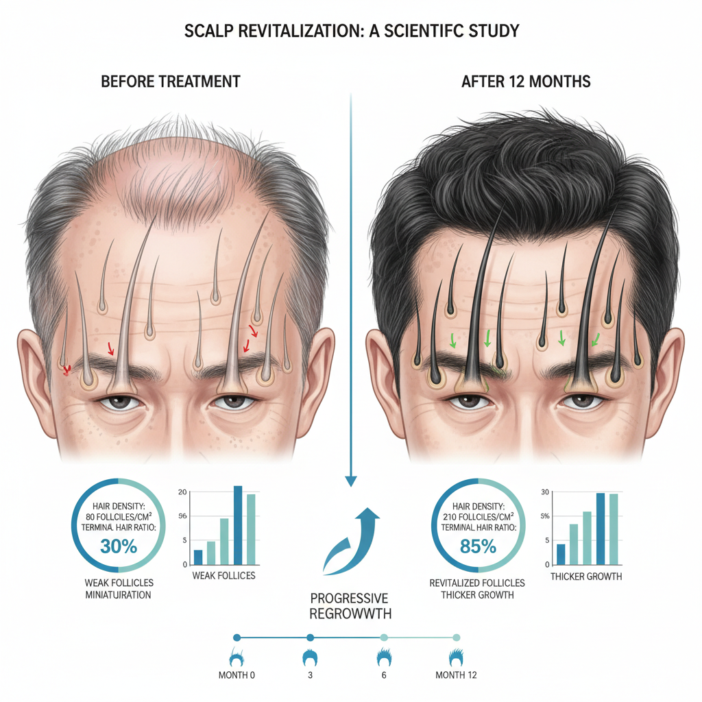 6〜12ヶ月目:目に見える回復。 頭頂部の密度が明らかに増した。写真を撮って比較すると、地肌の透け感が軽減しているのがわかった。この時期に美容師から「最近、ボリューム出ましたね」と言われたのが嬉しかった。M字部分も少し産毛が生えてきたが、まだまだ薄い状態。
